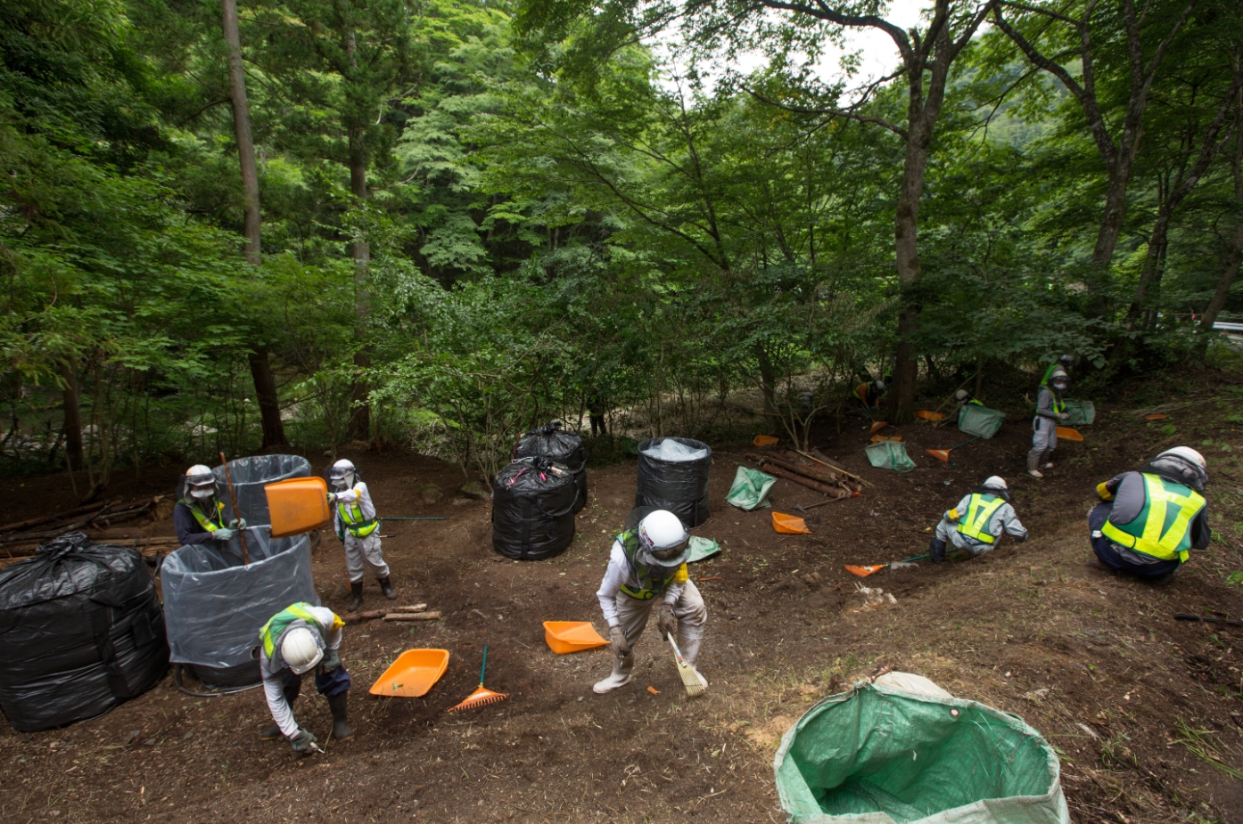 環境省による除染は、宅地・農地・山、という区分けで行われるが、宅地は家屋やその周り、農地は作つけ面のみの除染で、田畑脇のあぜ道等は除染対象外。山にいたっては、林縁から 20メートルの範囲にある落ちた葉や枝を取り除き、下枝を切るなどして「除染完了」としている。「除染」した場所の線量は下がるが、森の中に入り込めば当然高い線量のままだ。村内にはまだ、政府の長期除染目標である毎時 0.23マイクロシーベルトよりもはるかに高い地点がいくつもあることが、NGO の調査でわかっている。